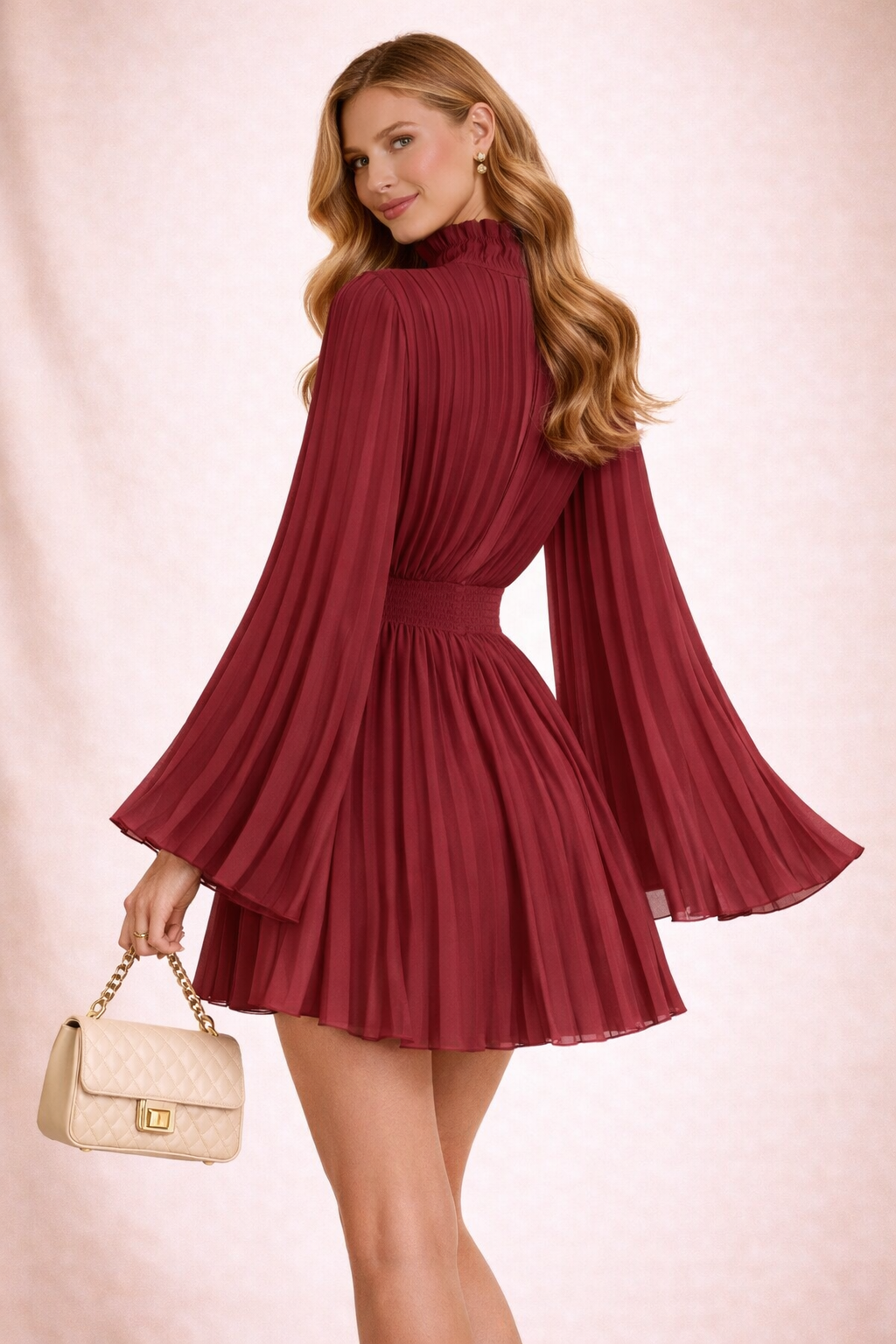 Cette robe combine trois éléments puissants : une couleur bordeaux profonde, un plissé structuré qui capte la lumière et une coupe courte féminine. Le résultat est une robe élégante et visuellement forte, idéale pour une boutique spécialisée dans les robes plissées.