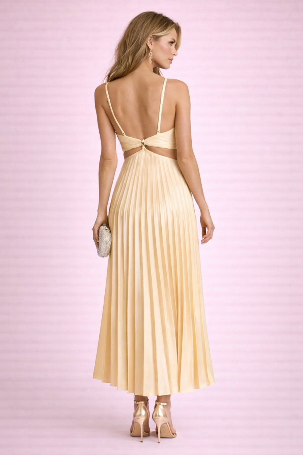 La robe plissée longue satin jaune champagne lumineux révèle une silhouette élancée et raffinée.