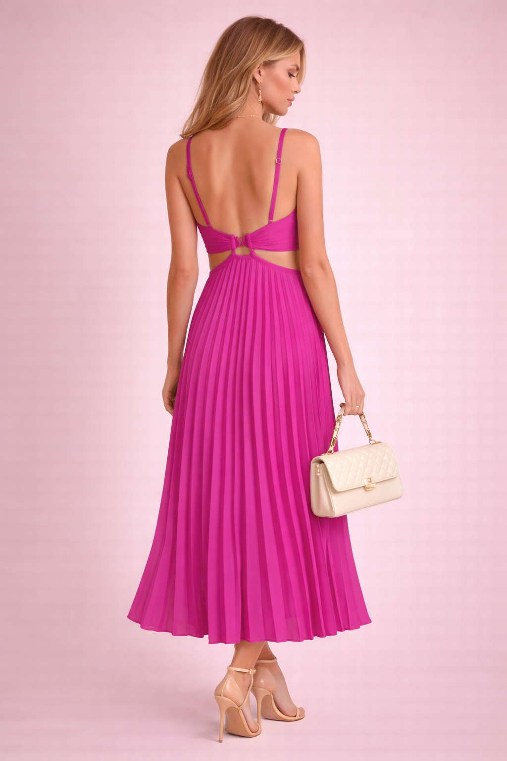 La robe plissée longue satin rose fuchsia intense révèle une silhouette élancée et lumineuse.