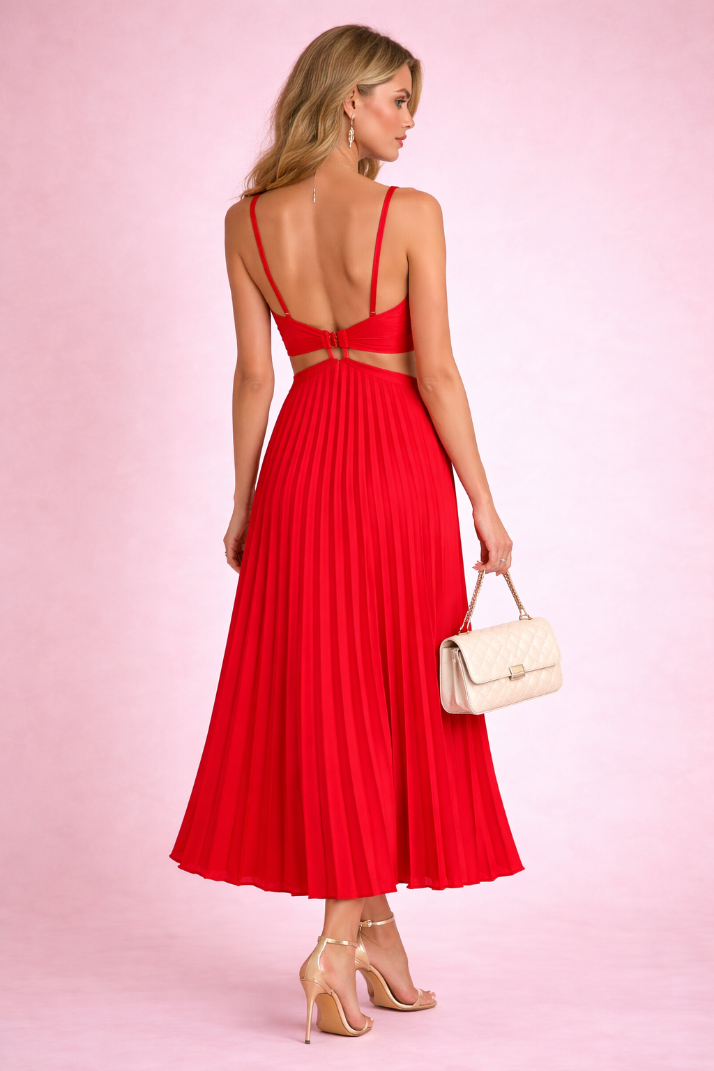 La robe plissée longue satin rouge carmin intense affirme une silhouette élancée et sophistiquée.